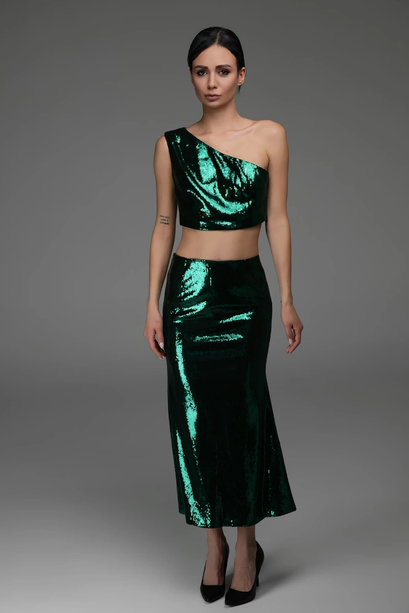 Top monospalla paillettes verde smeraldo