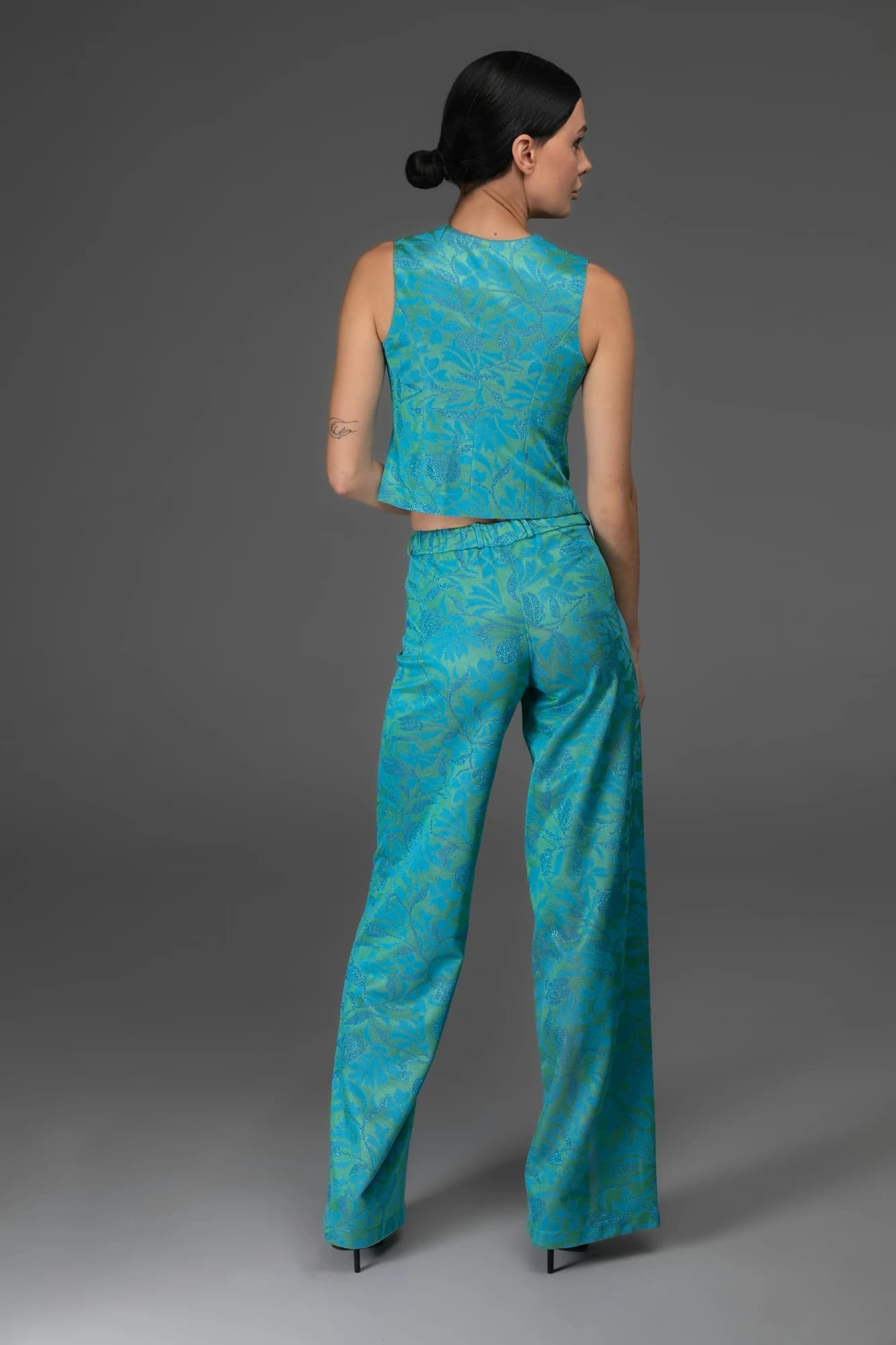 Pantalone del completo coordinato in tessuto jacquard con fantasia tono su tono nelle sfumature del verde e turchese.