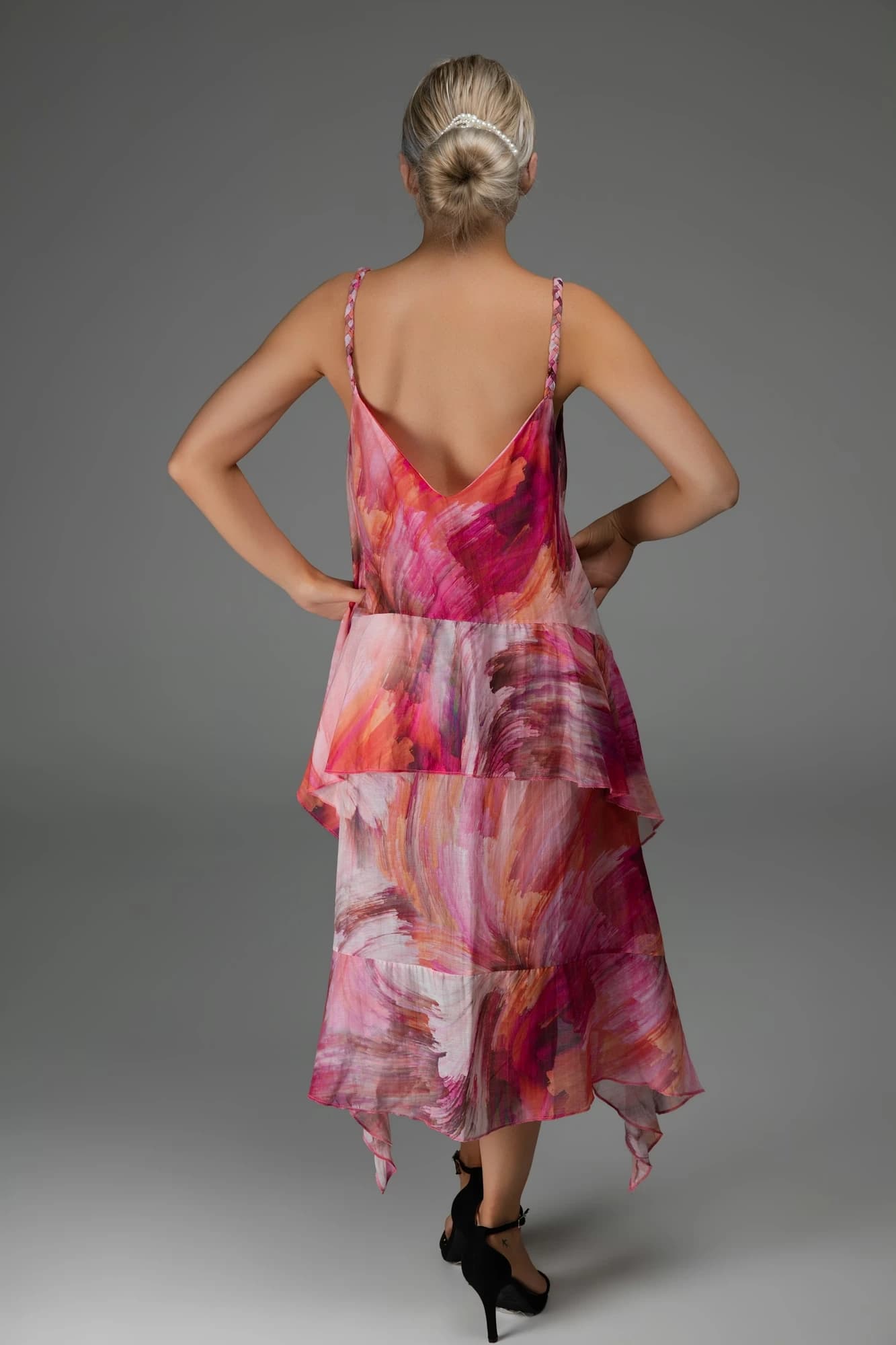 Realizzato in tessuto leggero e impalpabile, presenta una stampa artistica nei toni del rosa, fucsia e pesca, che crea un raffinato effetto acquerello. Il taglio con spalline sottili e scollo a V valorizza il décolleté, mentre la linea morbida accompagna delicatamente la silhouette.