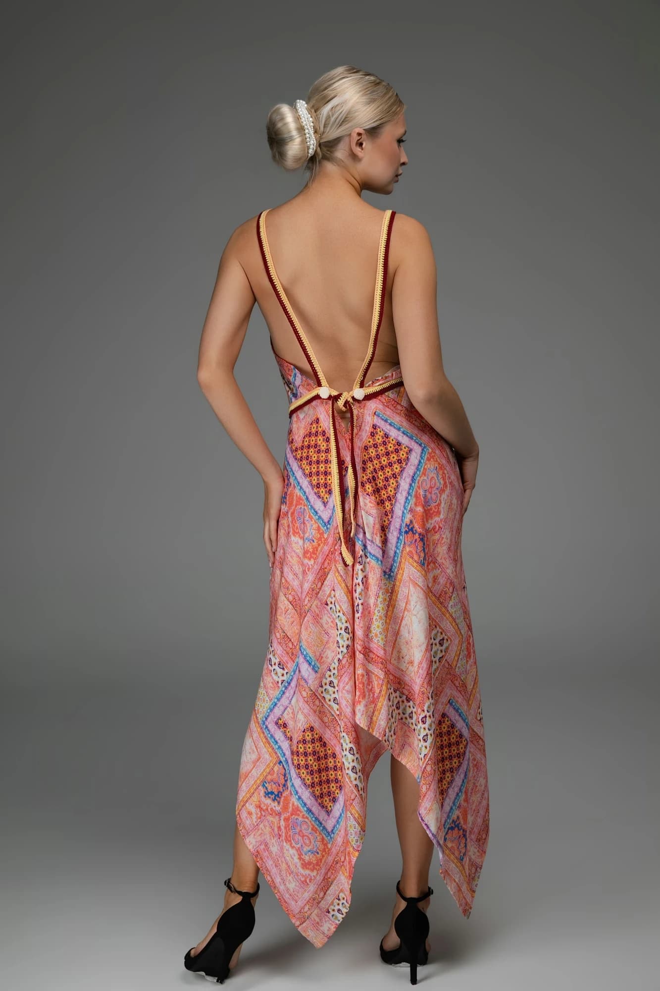 Il corpino ha scollo a V incrociato e sottili spalline, mentre la gonna lunga con orlo asimmetrico crea movimento ad ogni passo. La fantasia geometrica multicolor nei toni del rosa, arancio e azzurro dona un tocco vivace e contemporaneo.