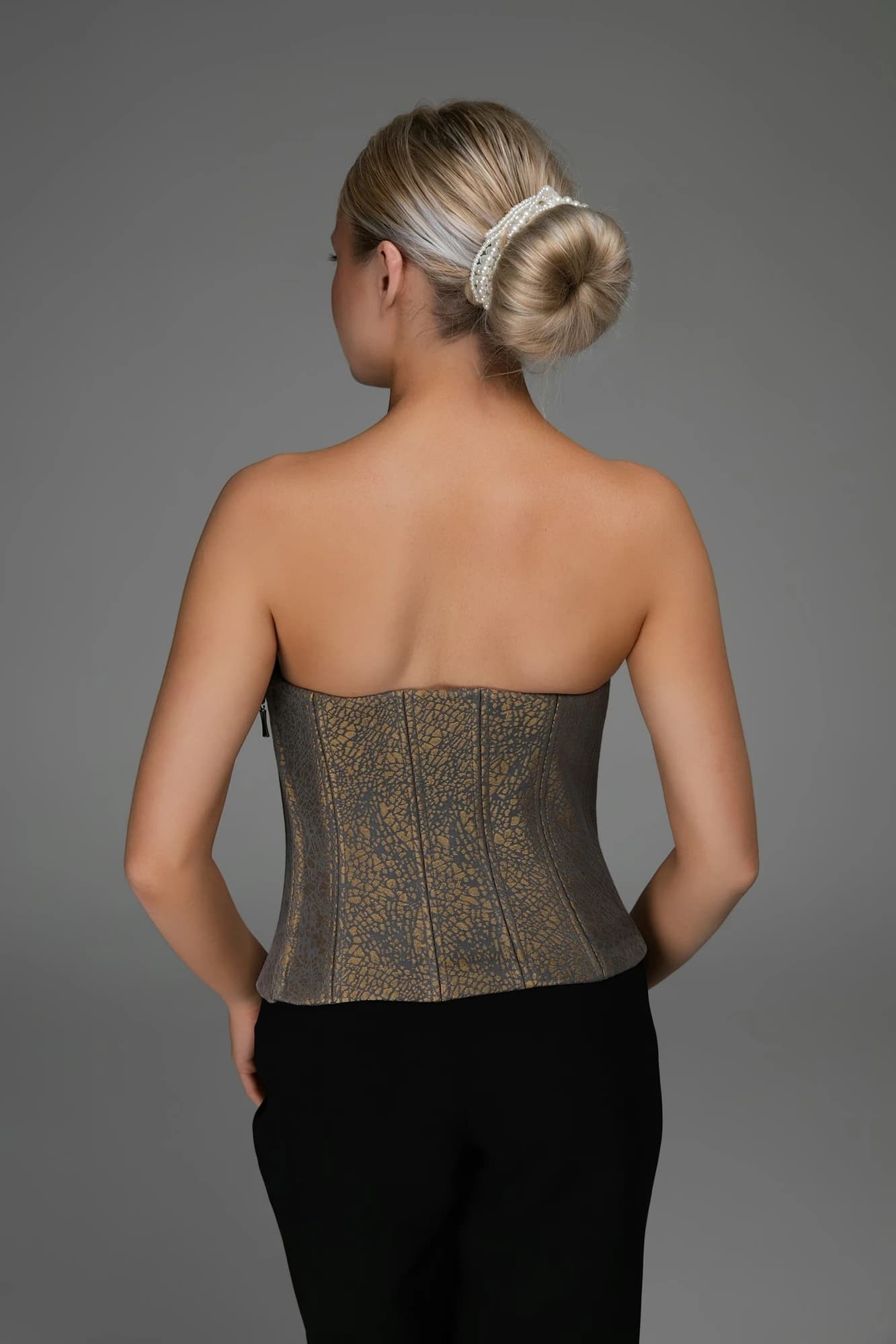 Realizzata in tessuto strutturato con una delicata texture effetto broccato nei toni oro e bronzo, presenta una linea femminile leggermente svasata che valorizza la silhouette. Il taglio pulito è arricchito da tre bottoni gioiello impreziositi da cristalli di vetro multicolore, che donano luminosità e un tocco di lusso al capo.
