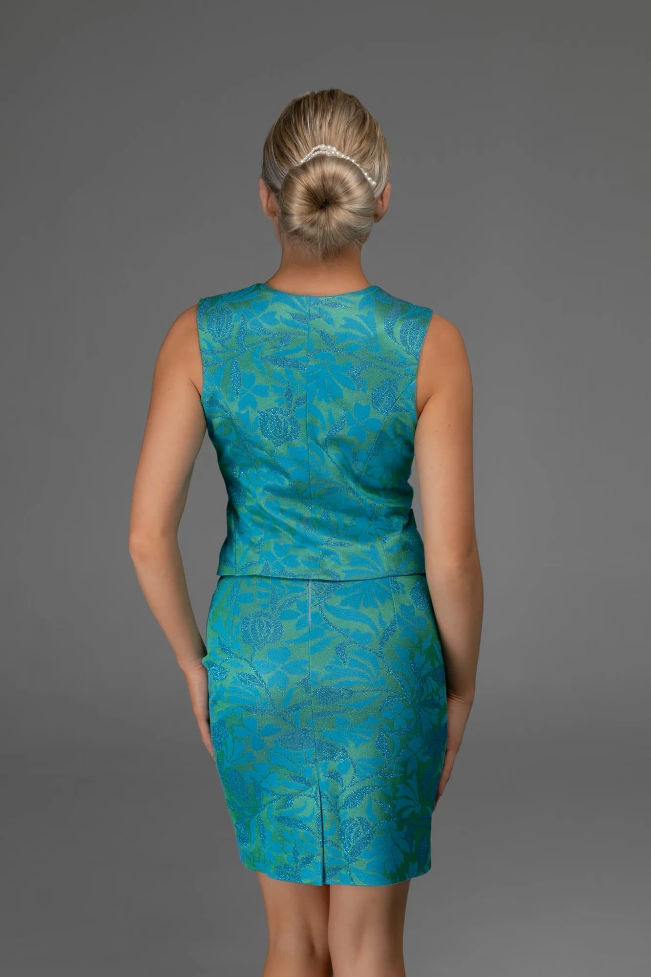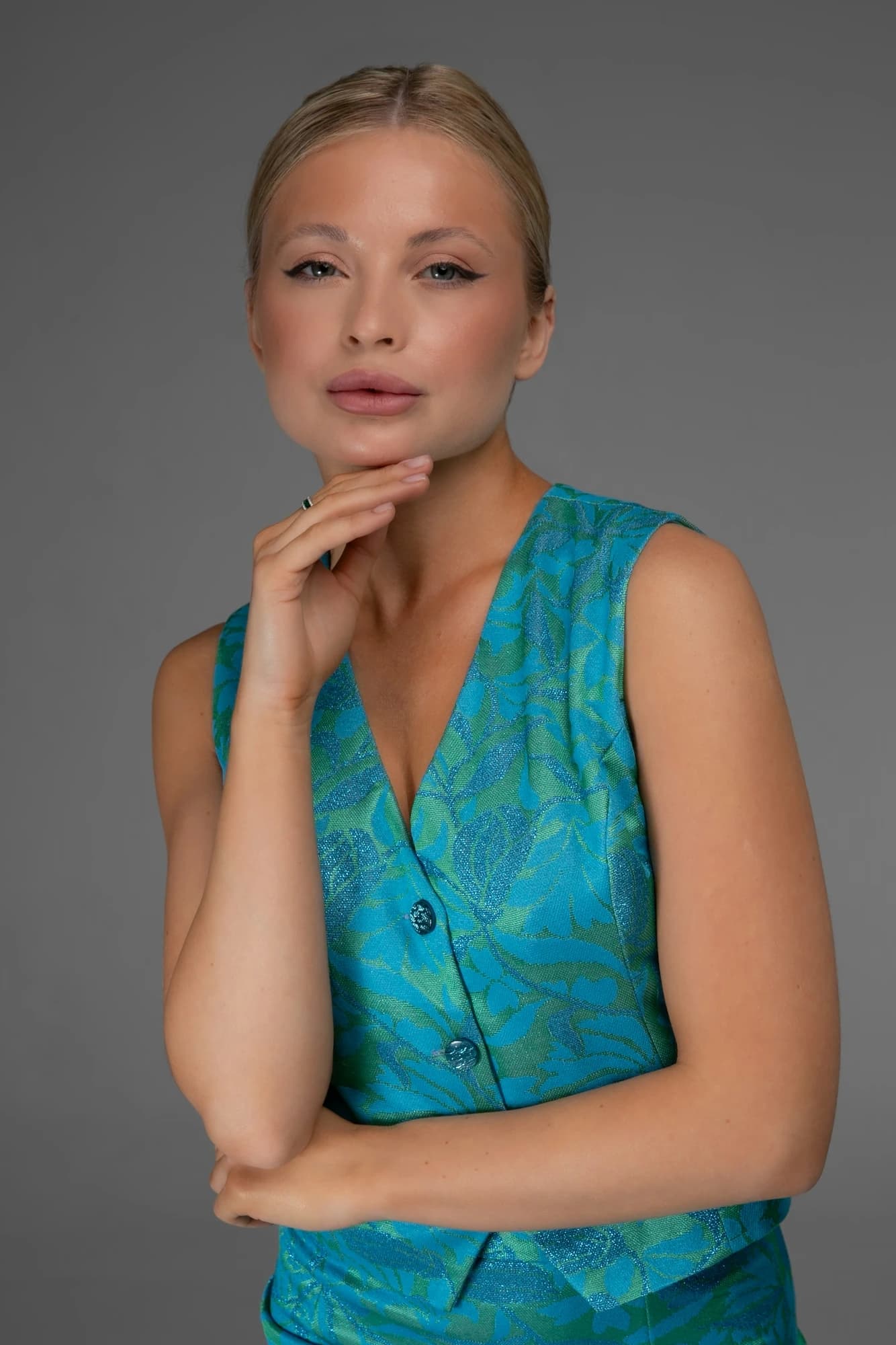 Gilet del completo elegante e contemporaneo in tessuto jacquard con raffinata fantasia tono su tono nelle sfumature del verde e turchese.