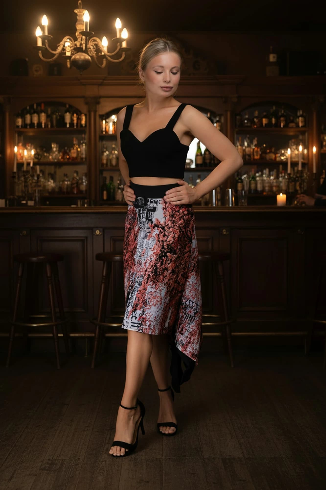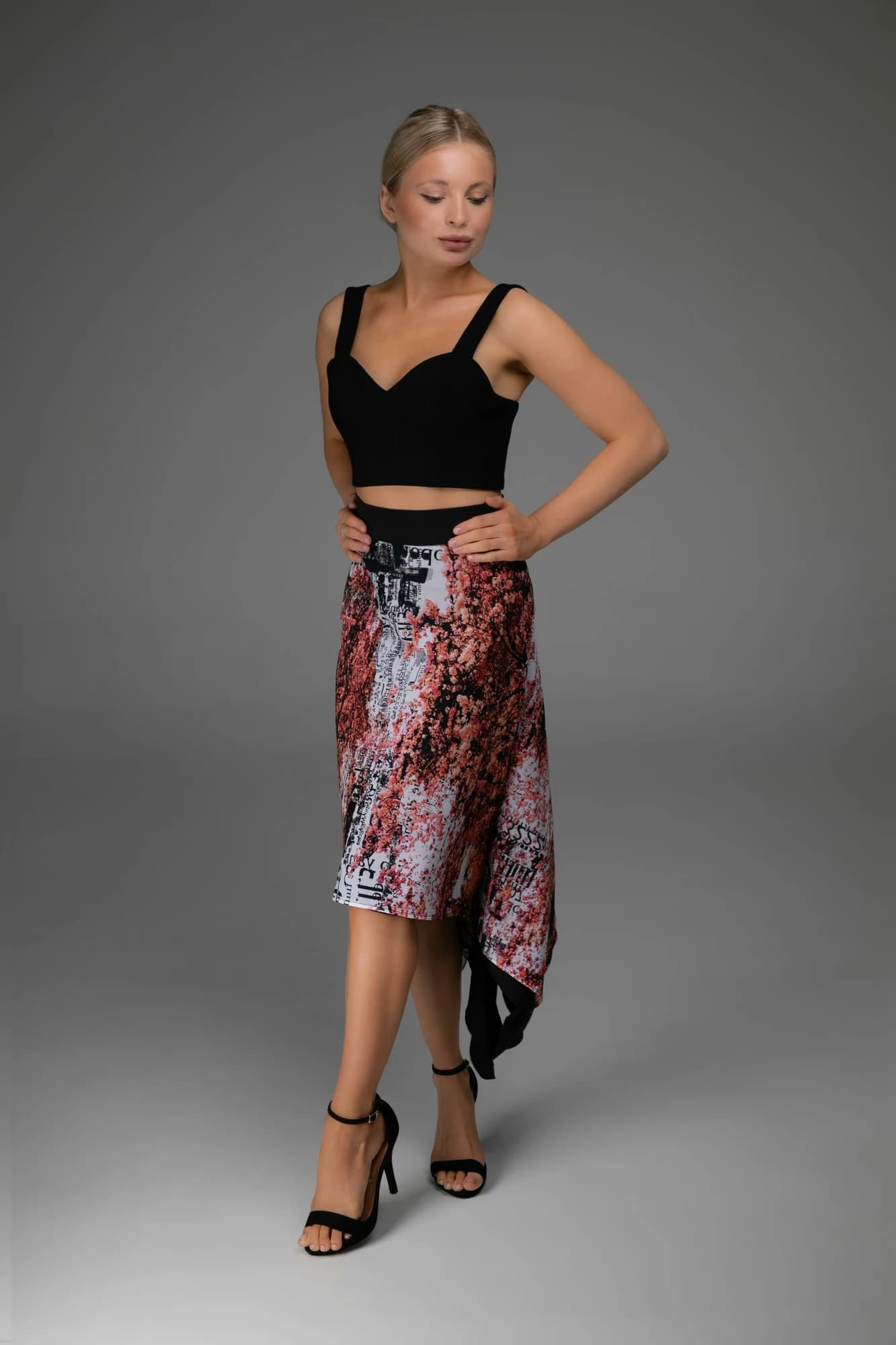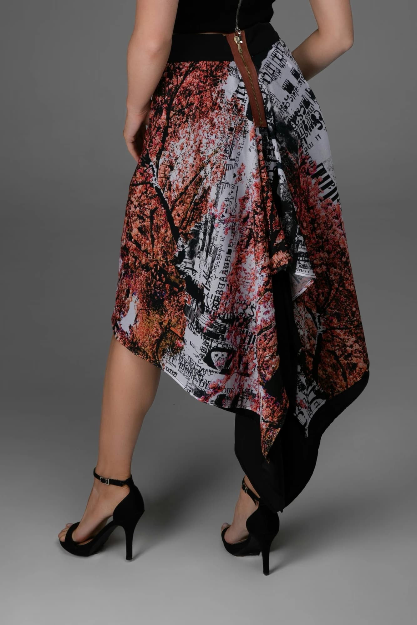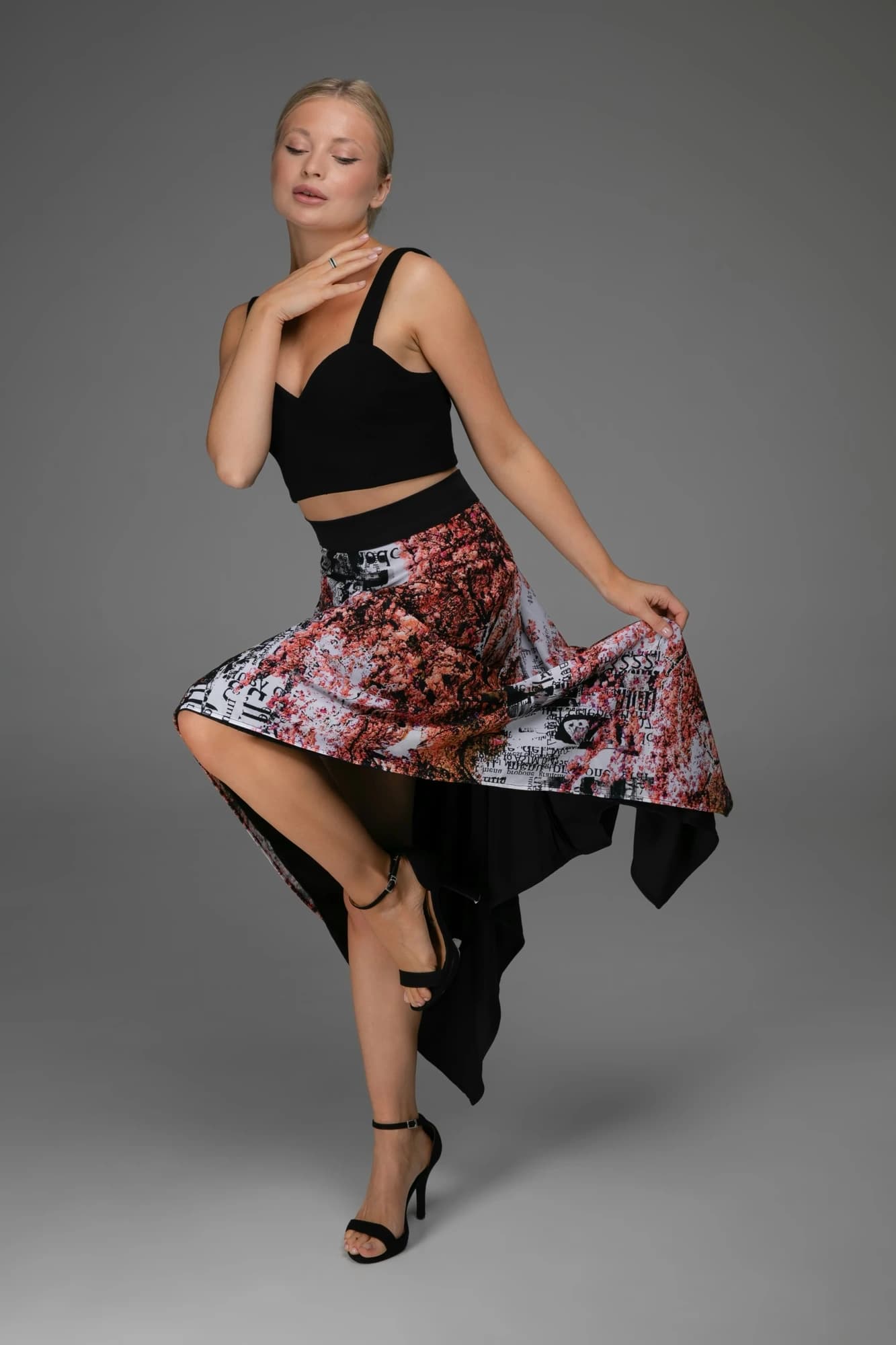 Gonna asimmetrica in tulle elasticizzato con stampa astratta rosso/nero/bianco.