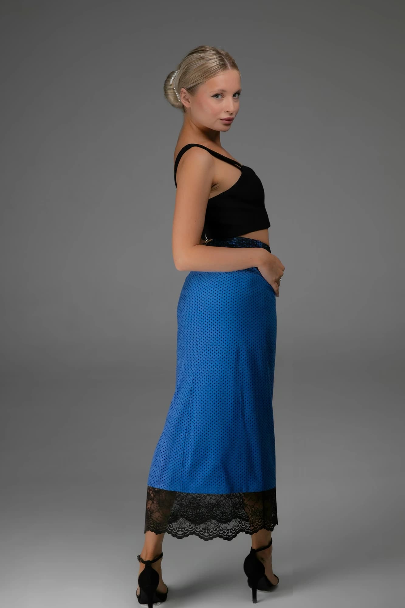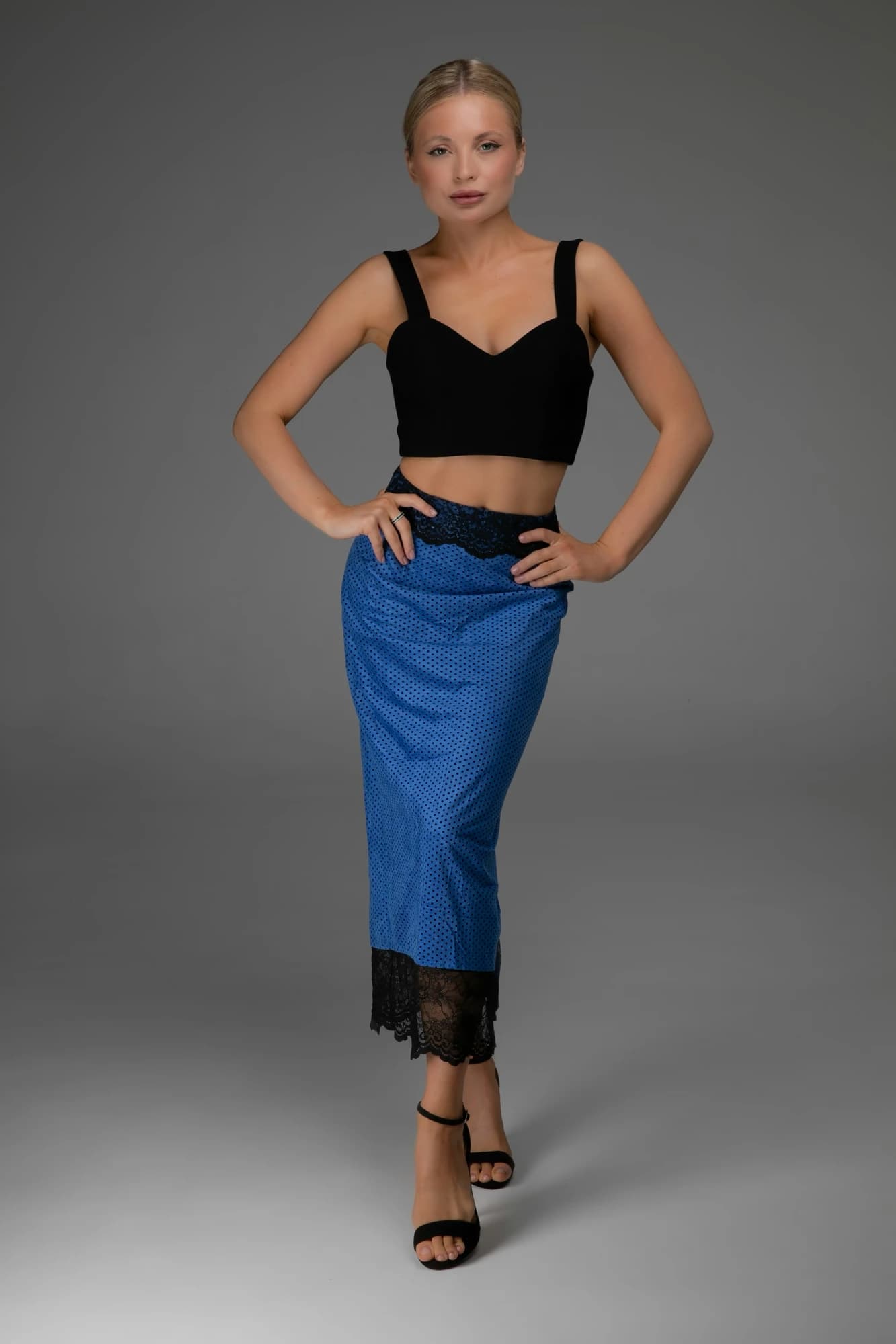 Gonna longuette blu elettrico, vita alta e taglio aderente che scende morbida fino al fondo impreziosito da inserti in pizzo nero. Dettaglio femminile e sofisticato che sottolinea la femminilità e charme sensuale.