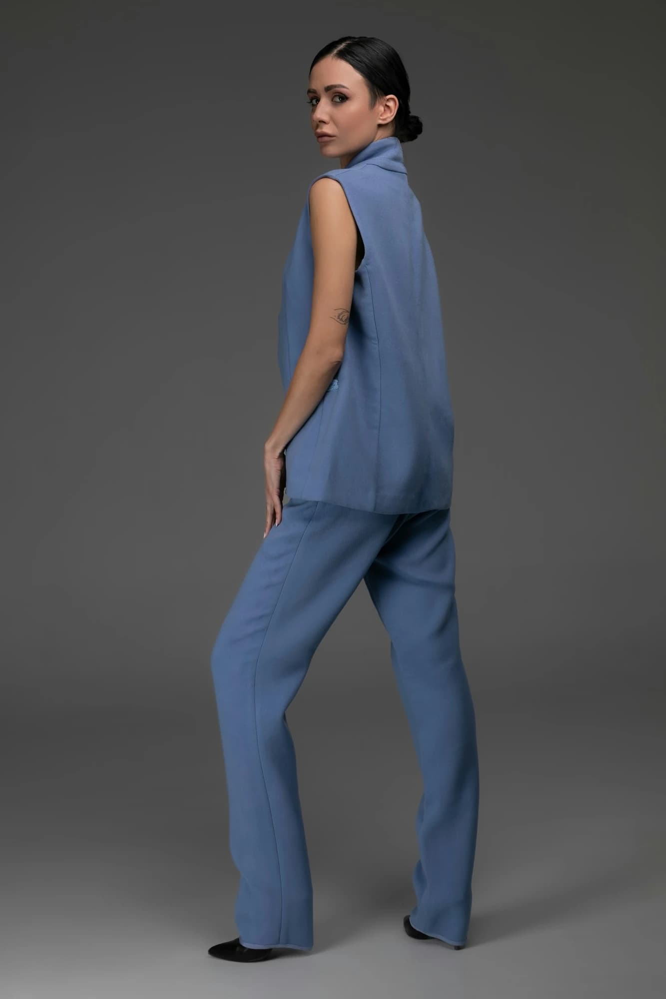 Tailleur in lana blu polvere con gilet lungo e pantalone a gamba dritta.