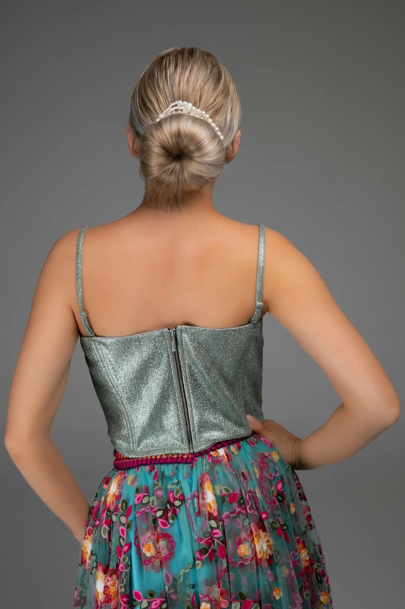 Top da sera in raso con scollo incrociato e spalline regolabili.